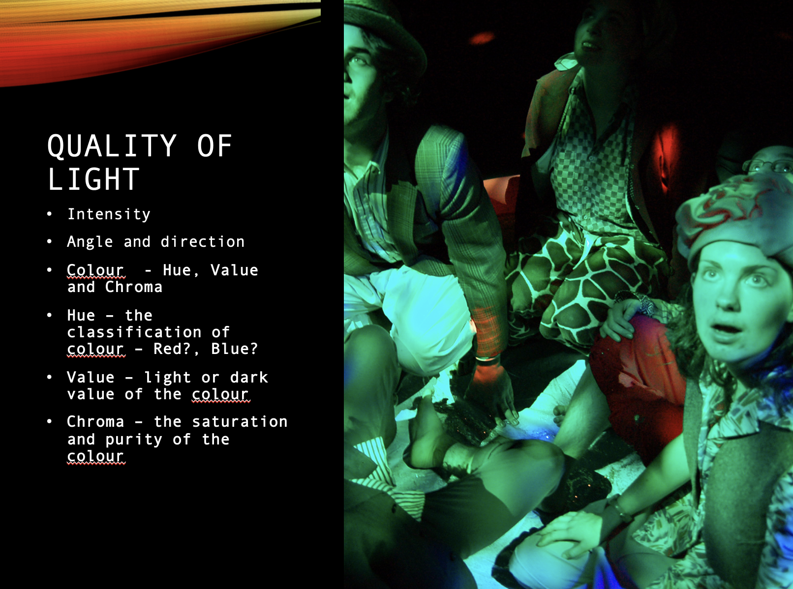 This NEX Lighting workshop Powerpoint resource offers an introduction to the fundamentals of theatrical lighting, to blend technical proficiency with collaborative practice. The presentation explores essential lighting fixtures such as the PC, Fresnel, and Profile Spot, and demonstrates the importance of safe, clear communication in design. The technical skills covered include using angle (Front, Back, Side) and colour (Warm/Cold) to create powerful, deliberate effects on stage. The primary goal is to provide the skills necessary to craft an effective "stage picture" that thoughtfully supports the dramatic work, ensuring the lighting design is both technically sound and fully integrated with the overall production.